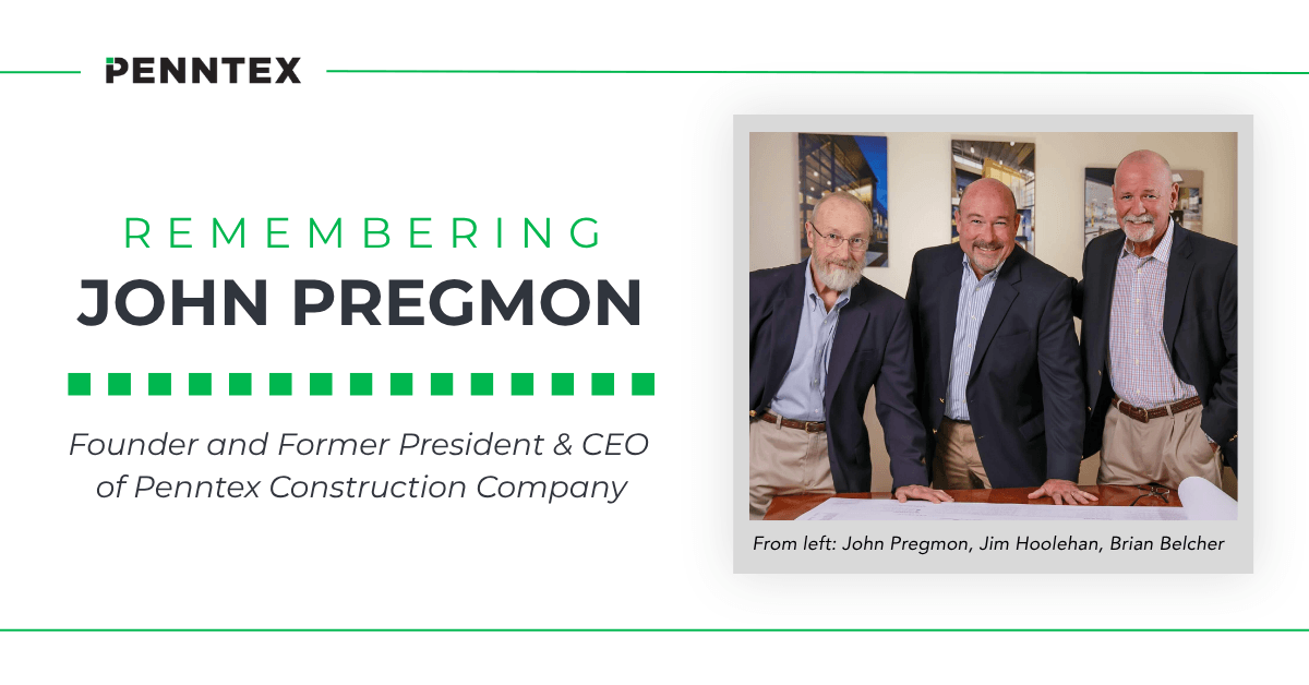It is with great sadness that Penntex Construction announces the passing of John Pregmon, founder and former President & CEO. For more than four decades, John led Penntex with a steady hand, building a company rooted in dependability, integrity, and an unwavering commitment to client service. His legacy is reflected not only in the company’s growth and the projects completed under his leadership, but also in a culture defined by accountability and pride in doing things right.